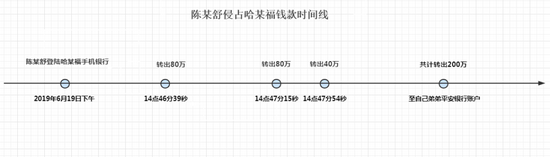 事后,陳某舒利用銀行內的平板電腦,登陸哈某福的手機銀行,僅用了不到兩分鐘的時間,分三次將哈某福用于投資理財的200萬資金轉至自己的弟弟陳某名下。理財期滿后,因哈某福未收到理財金,遂前往陳某舒處,才得知自己的理財款已被其挪用。