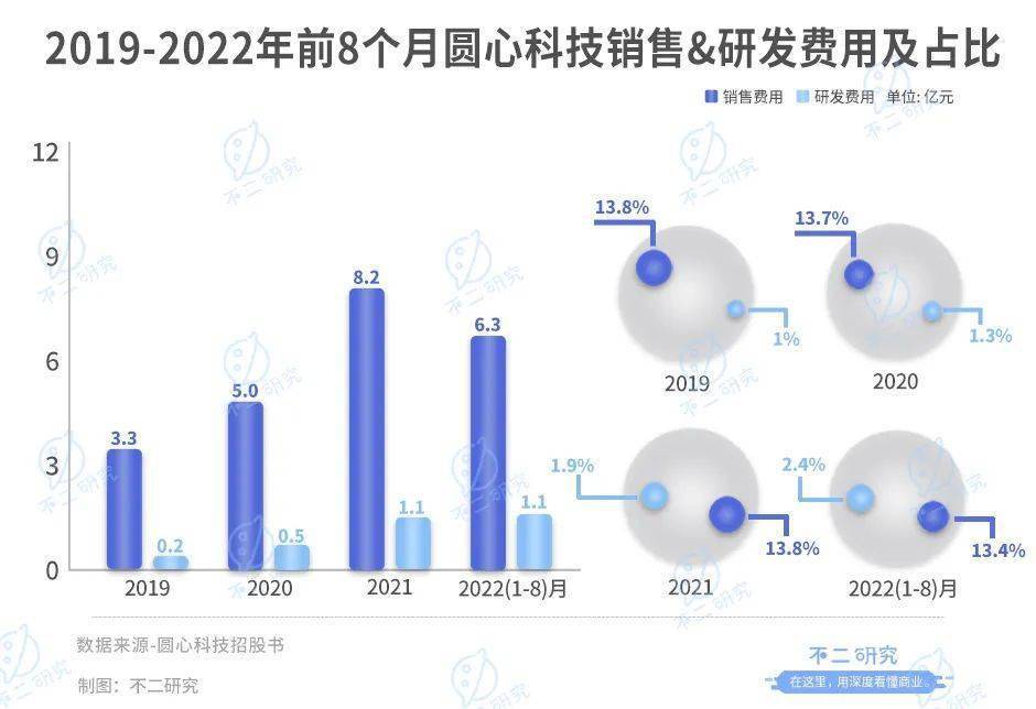 與之形成鮮明對比的是,2019-2021年及2022年前8個月,其研發開支為2265.1萬、4629.4萬、1.13億、1.14億,研發費率僅為1%、1.3%、1.9%、2.4%。