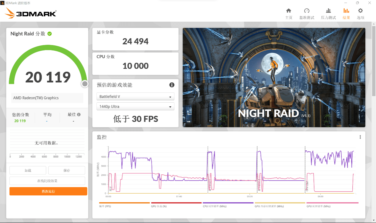 理論測試環節,我們用3DMark的《Night Raid》系列跑了一下。從24494的顯卡成績來看,ThinkPad到底是生產力工具,雖然核顯有所提升,但在如此輕薄的體積限制之下,用它玩3A大作那恐怕還是不太行,最好還是用來辦正事。