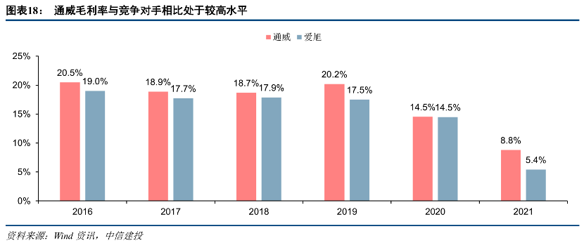 在此背景下,盡管電池片毛利率水平仍高于競爭對手,但相較2020年之前仍出現(xiàn)了大幅下滑。2021年,電池片及組件環(huán)節(jié)(主要是電池片)毛利率僅為8.81%,相比2019年同期水平(20.2%)已經(jīng)腰斬。