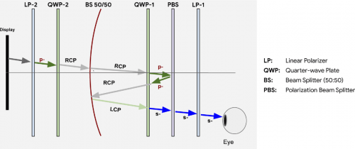 使用偏振折疊機制,可以在緊湊的器件內,實現光源的傳輸和虛像放大。具體來看,在經典的 Pancake 光學設計中,來自顯示器的光首先通過一個圓形偏振器(假設為RCP)和一個半反半透鏡,然后通過一個1/4相位片(QWP)傳輸,該 QWP 將光的偏振改變為 P 偏振。
