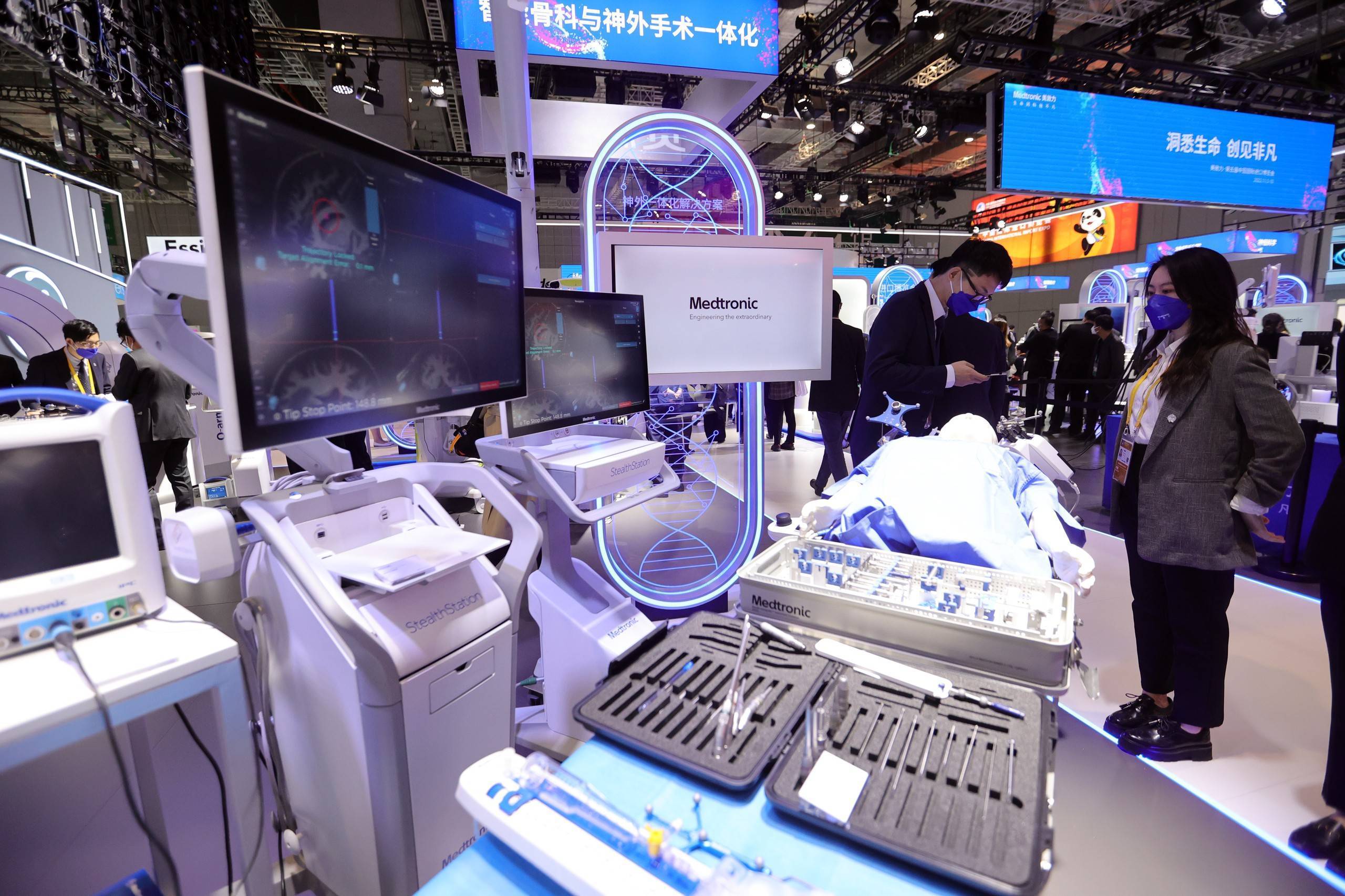 2022年11月6日,上海,第五屆中國國際進口博覽會舉行,醫療器械級保健醫藥展區,美敦力首款神經外科機器人亮相進博會。