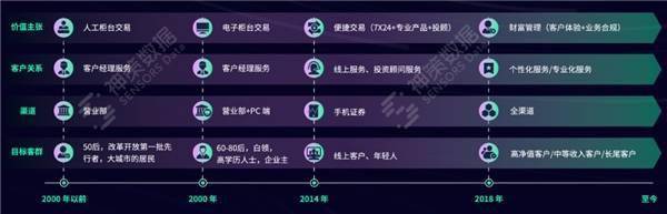 隨著技術(shù)的進步,尤其是通信和網(wǎng)絡(luò)技術(shù)的進步,證券零售經(jīng)紀業(yè)務(wù)經(jīng)歷了四個階段的發(fā)展:2000 年以前,主要是人工柜臺交易,目標客群是 50 后,改革開放后的第一批大城市居民。2000 年的時候,是電子柜臺交易,目標客群是 60-80 后,白領(lǐng)、高學歷人士等。2014 年前后,智能手機開始普及,線上客戶越來越多,年輕人越來越多。2018 年以來,價值主張就擴展為財富管理,目標客群更加的多元化。可以說技術(shù)發(fā)展在推動商業(yè)模式演進,證券零售業(yè)務(wù)從傳統(tǒng)業(yè)務(wù)向深化客戶關(guān)系、利用網(wǎng)絡(luò)提供多元化服務(wù)轉(zhuǎn)型。