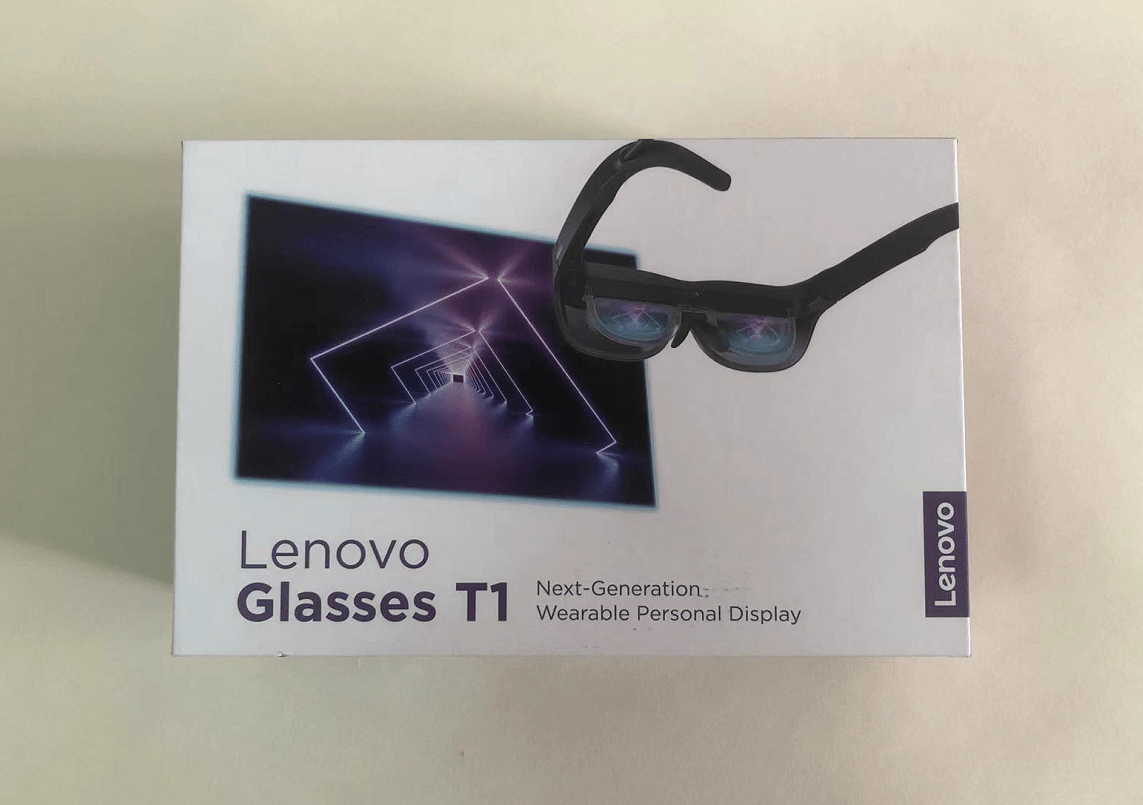 初識聯想YOGA智能眼鏡T1,外包裝為長方體盒子。在盒子正面,為聯想YOGA智能眼鏡T1的產品圖片以及佩戴時展現在用戶眼中的大屏幕,這正好印證“把 81 英寸大屏裝進口袋 ”這句經典話術。在盒子右下方為Lenovo Glasses T1的英文字母,以及“下一代可穿戴顯示設備”的英文slogan。