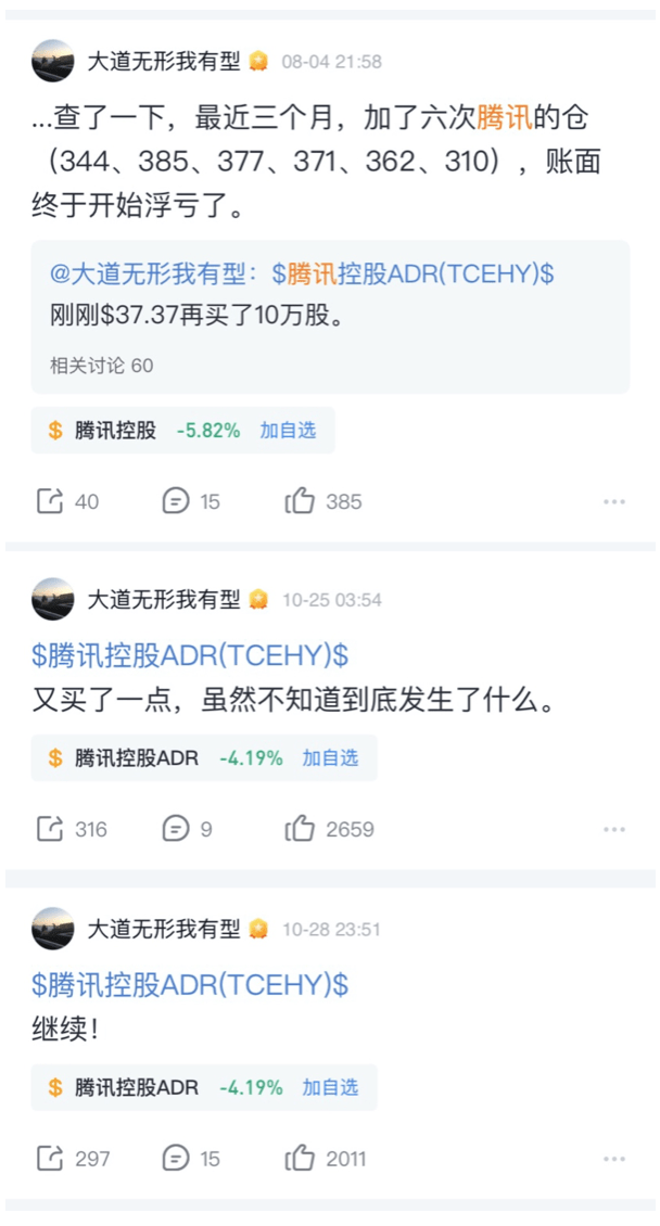 回顧以往,最近一次買入騰訊是10月13日,段永平表示,買入了美國掛牌的騰訊ADR價格為32.05美元,合計買入10萬股。
