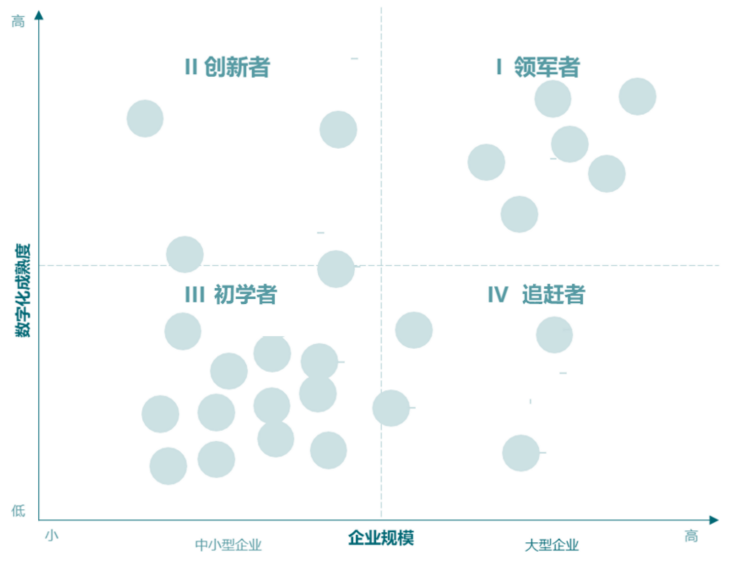 在德勤的調(diào)研中,企業(yè)依據(jù)規(guī)模和數(shù)字化成熟度分為四種狀態(tài)(參照下圖):領(lǐng)軍者,數(shù)字化成熟度高的大型企業(yè);創(chuàng)新者,數(shù)字化成熟度高中小型企業(yè);初學(xué)者,數(shù)字化成熟度低的中小型企業(yè);追趕者,數(shù)字化成熟度低的大型企業(yè)。而DAAS體系可適用于各種數(shù)字化現(xiàn)狀的企業(yè)。