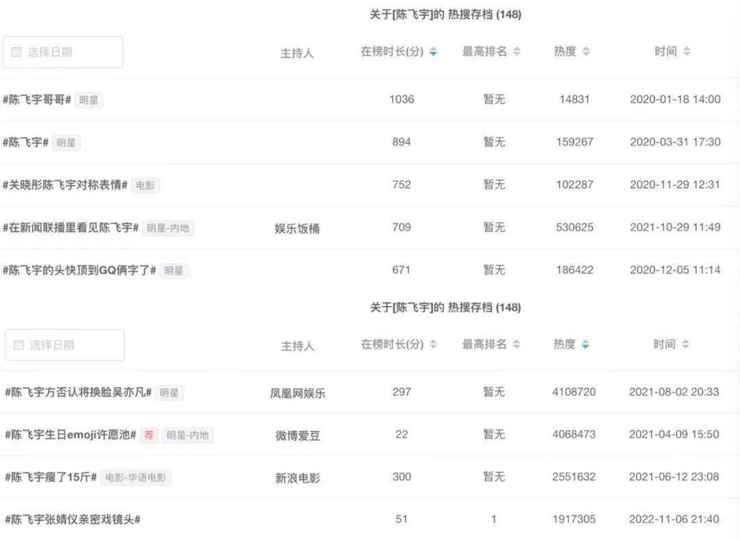 根據熱搜搜索引擎數據,陳飛宇在榜時間最長的熱搜話題是2020年上榜的#陳飛宇哥哥#,熱度最高的話題是2021年上榜的#陳飛宇方否認將換臉吳亦凡#;