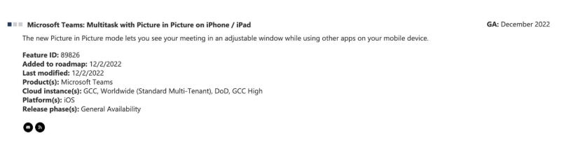 IT之家獲悉,根據(jù) Microsoft 365 路線圖頁(yè)面,微軟 Teams 正計(jì)劃在 12 月為 iOS 設(shè)備增加畫(huà)中畫(huà)支持。目前還沒(méi)有確切發(fā)布日期。