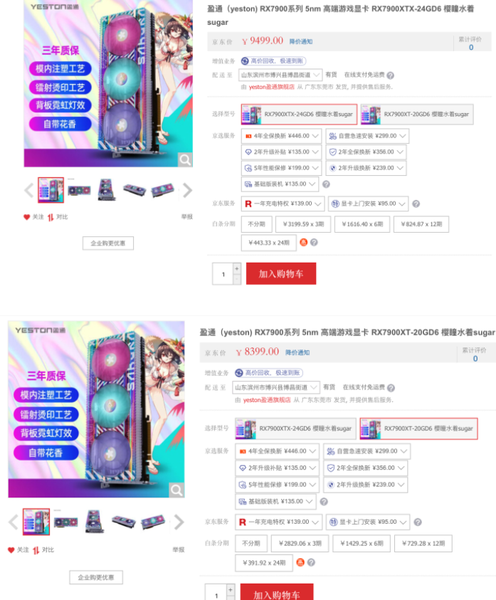 如上圖所示,盈通京東旗艦店現(xiàn)已現(xiàn)貨開售 RX 7900 系列櫻瞳水著顯卡,RX 7900 XT 售價 8399 元,RX 7900 XTX 售價 9499 元。