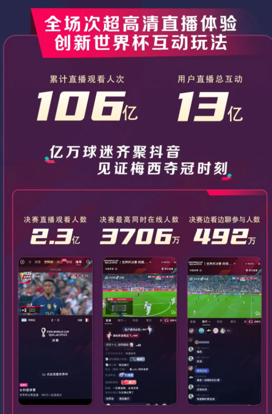 原標(biāo)題:抖音:2022 世界杯累計直播觀看人次達(dá) 106 億,決賽觀看人數(shù) 2.3 億