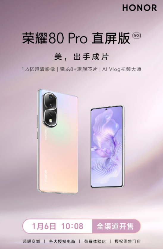1 月 6 日消息,榮耀手機(jī)官方推出榮耀 80 Pro 直屏版,于 1 月 6 日 10 : 08 全渠道開售。該機(jī)采用 1.6 億像素超清影像,搭載驍龍 8+ Gen 1 芯片,支持 AI Vlog 視頻大師,6 大場景智慧識別功能。目前該機(jī)已上架京東商城,顯示 12GB+256GB 售價(jià) 3599 元。
