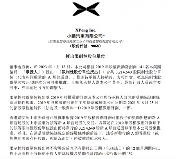 1 月 19 日消息,小鵬汽車發布公告稱,于 2023 年 1 月 18 日,公司根據 2019 年股權激勵計劃向 141 名集團雇員授出合共 321.5 萬股限制性股份單位,A 類普通股于授予日期的收市價格每股 36.40 港元(當前約 31 元人民幣)。