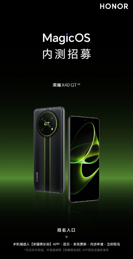 報名入口為手機端進入 [榮耀俱樂部] App-首頁-系統更新-內測申請-立即報名。目前僅支持手機端,升級前請將 [榮耀俱樂部] App 更新至最新版本。