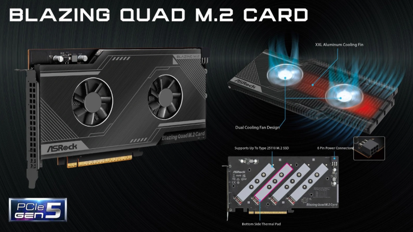 2 月 16 日消息,華擎為全新的 W790 工作站主板推出了 Blazing Quad PCIe 5.0 擴(kuò)展卡,支持四個 M.2 SSD。