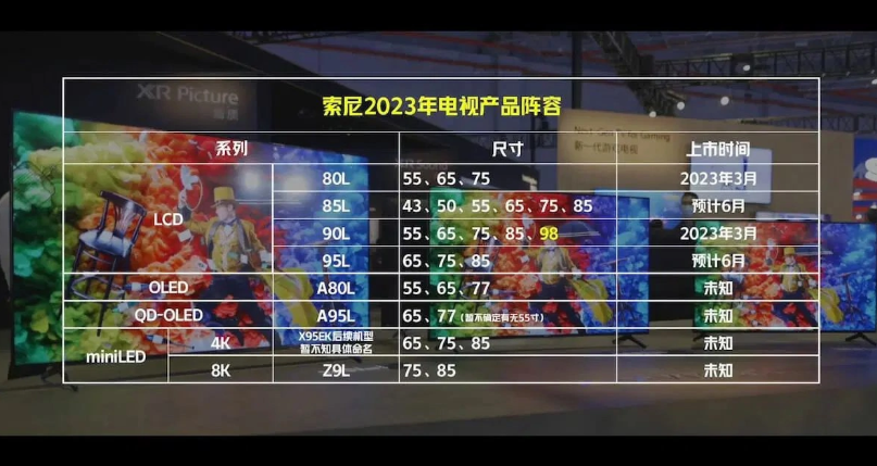 采用 LCD 屏幕的電視系列包括 X80L、X85L、X90L 和 X95L,尺寸從 43 英寸到 98 英寸不等。而采用 OLED 屏幕的電視系列只有 A80L,據稱將提供 55、65 和 77 英寸,以替代被市場認可的 A80K。此外還有采用 QD-OLED 面板的頂級機型 A95L。