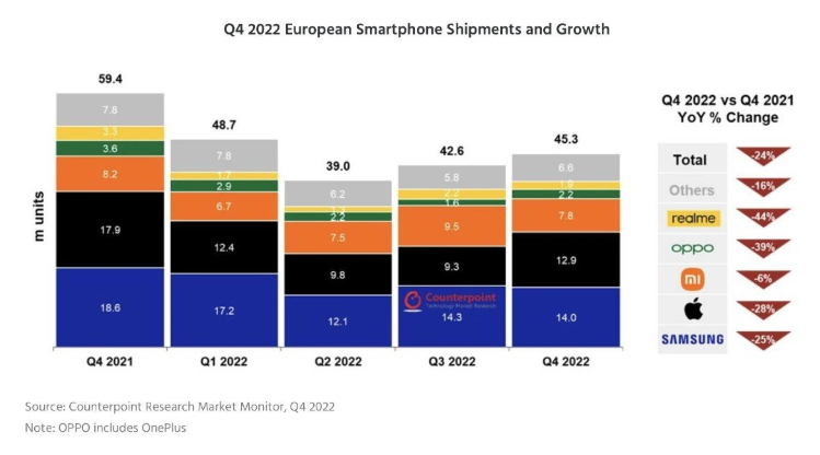2 月 24 日消息,根據市場調查機構 Counterpoint Research 公布的統計數據,歐洲智能手機市場 2022 年出貨量為 1.76 億臺,同比下降了 17%,創下自 2012 年以來的最低水平。