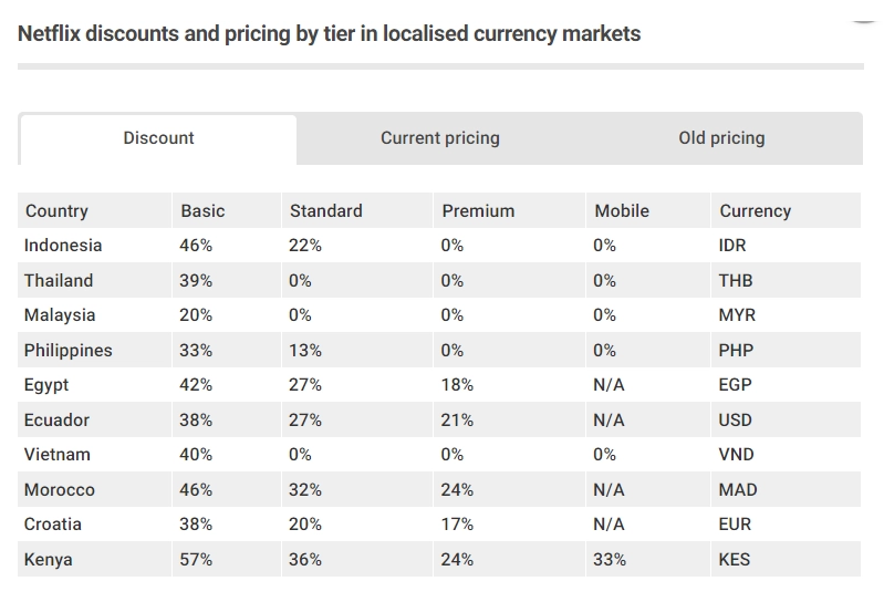 據《華爾街日報》稱,這些降價政策只適用于部分級別的 Netflix 訂閱,不過在某些情況下接近半價。根據 Amepere Analysis 的說法,Netflix 將為其基本、標準和高級計劃制定新的定價,折扣范圍從 13% 到 60% 不等。