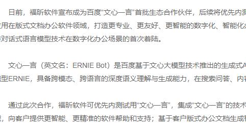 通過此次合作,福昕軟件可優(yōu)先內(nèi)測(cè)試用“文心一言”,集成“文心一言”的技術(shù)能力,在百度技術(shù)團(tuán)隊(duì)協(xié)助下通過“文心一言”對(duì)話式語(yǔ)言模式的賦能,向客戶提供更智能、更精準(zhǔn)的軟件幫助和支持;基于客戶版式辦公文檔生成智能摘要;文檔內(nèi)容智能搜索及給出修改建議……結(jié)合福昕版式文檔技術(shù)優(yōu)勢(shì),以向客戶提供一站式、智能化、全生命周期的數(shù)字化辦公服務(wù),滿足用戶的進(jìn)階需求、強(qiáng)化產(chǎn)品競(jìng)爭(zhēng)力,踐行“開發(fā)市場(chǎng)領(lǐng)先和創(chuàng)新性的PDF產(chǎn)品及服務(wù),幫助知識(shí)工作者在處理文檔時(shí)提高生產(chǎn)率并能做更多”的福昕使命!