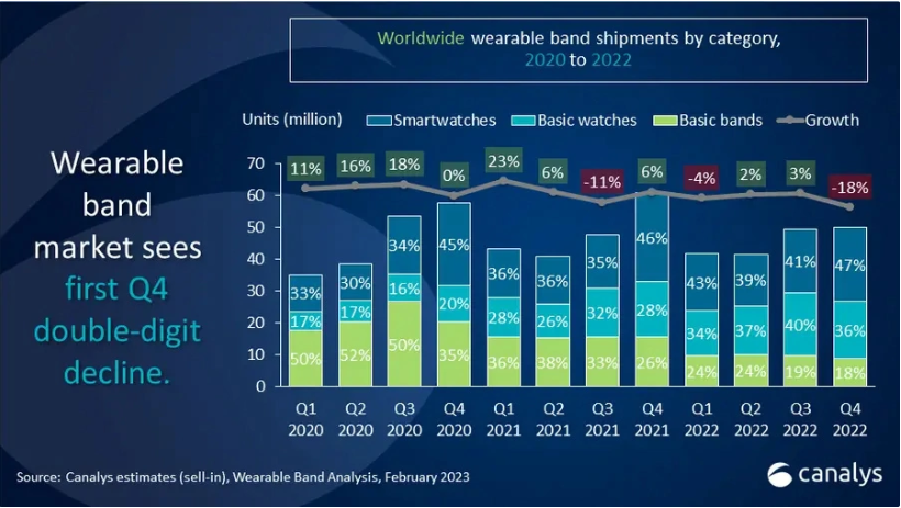 3 月 10 日消息,市場調查機構 Canalys 在最新報告中指出,全球可穿戴手環市場在 2022 年第 4 季度出貨量為 5000 萬臺,同比下降了 18%。由于圣誕節等因素,第 4 季度通常是旺季,這也是首次出現 2 位數的跌幅。
