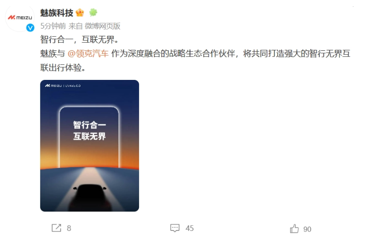 3 月 13 日消息,魅族微博發文宣布:“智行合一,互聯無界。魅族與 @領克汽車 作為深度融合的戰略生態合作伙伴,將共同打造強大的智行無界互聯出行體驗。”
