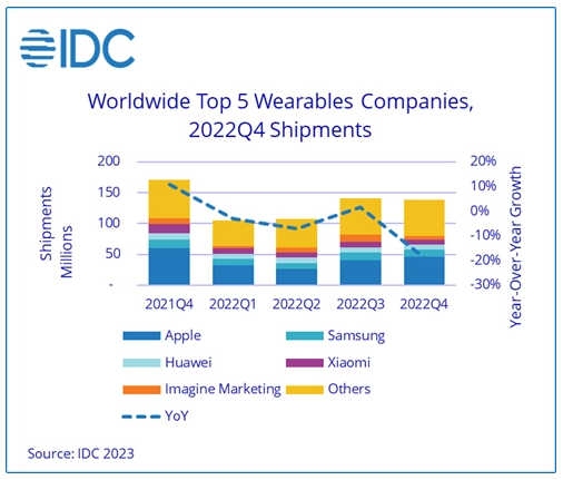 原標題:IDC:2022 年 Q4 全球可穿戴設備出貨量約 1.4 億臺,同比下降 18.9%