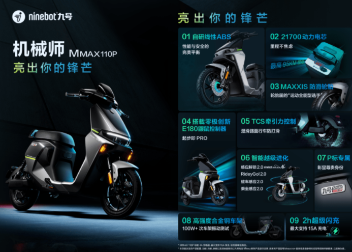 九號電動先后推出了包括 C 系列、B 系列、E 系列、F 系列,M 系列等多產品(以機械師 MMAX 110P 為例,該車搭載 TCS 牽引力控制、ABS 防抱死系統、零極創新控制器等,續航 95Km)。