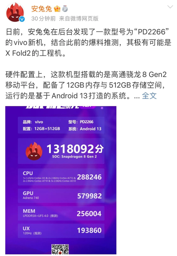 原標題:vivo X Fold2 折疊屏手機安兔兔跑分曝光,總分達 131 萬 +