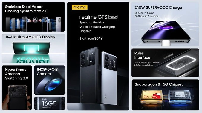 該設備預計將很快在印度推出,現已出現在印度 BIS 認證網站上,型號為 RMX3709.realme GT 3 手機搭載驍龍 8+ Gen 1 芯片、高達 240W 快速充電和 144Hz 刷新率 AMOLED 顯示屏。