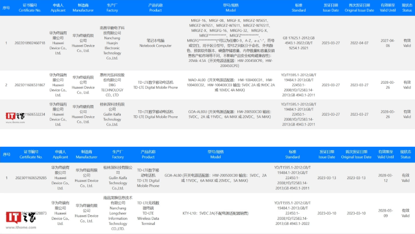3 月 29 日消息,現(xiàn)有一款型號為 GOA-AL80U 的華為 4G 新機通過了國家 3C 質量認證,顯示該機將支持 100W 有線快充。