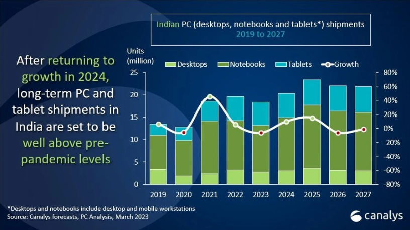 Canalys 預計 2023 年印度 PC 和平板電腦的出貨量為 1800 萬臺,同比下降 6%。這比全球市場的降幅要小,全球市場預計將收縮 9%。