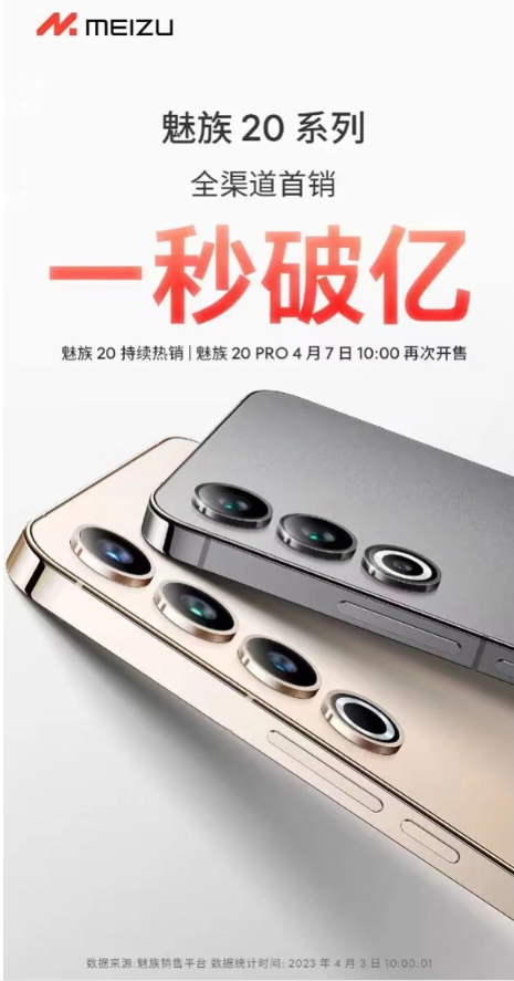 4 月 3 日消息,今日魅族 20 系列正式開售,剛剛官方發布了新機的首銷戰報,稱“一秒破億”。