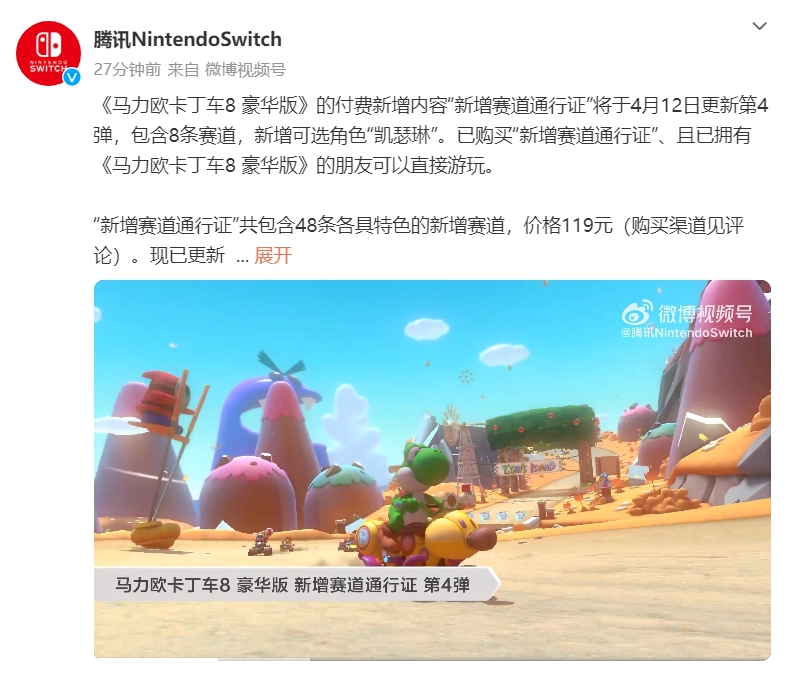 IT之家從騰訊 NintendoSwitch 官方微博處獲悉,“新增賽道通行證”共包含 48 條各具特色的新增賽道,價格 119 元。目前已更新 24 條賽道,4 月 12 日會更新第 4 彈共 8 條賽道,剩余 16 條賽道將在 2024 年底前陸續發布完畢。