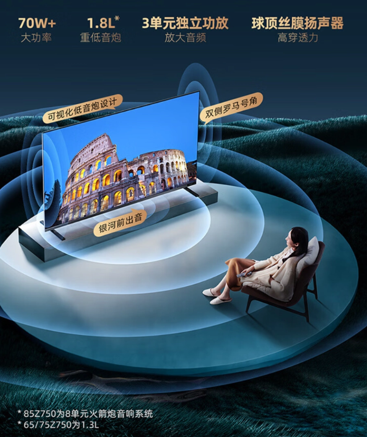 東芝音畫雙芯 Mini LED 影院電視 Z750 擁有 65/75/85 英寸三個版本,搭載新一代 Mini LED 顯示方案,號稱燈珠縮小 96%,亮度提升 4 倍,分別擁有 384/512/1296 背光分區(qū)。