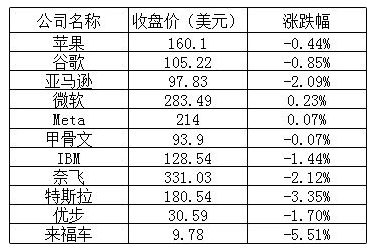 大型科技股多數下跌,亞馬遜和奈飛跌幅超過 2%,蘋果和谷歌跌幅不到 1%;Meta 和微軟上漲,但漲幅均不到 1%。