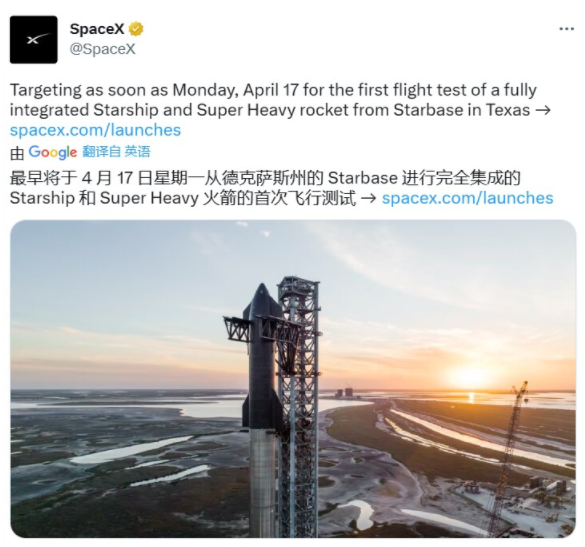 4 月 15 日消息,SpaceX 已經在上個月完成了星際飛船 / 星艦(Starship)的第一次完整靜態點火測試。今日,SpaceX 官方推特發文官宣,SpaceX 星際飛船將于 4 月 17 日在其南得克薩斯基地進行第一次軌道試飛。