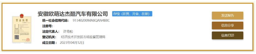 4 月 18 日消息,安徽歐萌達(dá)杰酷汽車有限公司成立,注冊(cè)資本 5000 萬(wàn)元,經(jīng)營(yíng)范圍包含:汽車銷售;銷售代理;貨物進(jìn)出口;信息咨詢服務(wù)。該公司由奇瑞汽車股份有限公司及其全資子公司蕪湖普瑞汽車投資有限公司共同持股。