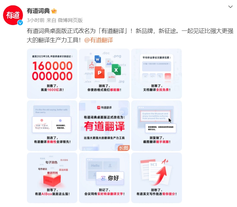 4 月 20 日消息,網(wǎng)易有道詞典官方微博今日發(fā)文表示,伴隨著有道詞典桌面版 V10.0.0 版本的發(fā)布,有道詞典桌面版即日起正式更名為“有道翻譯”。