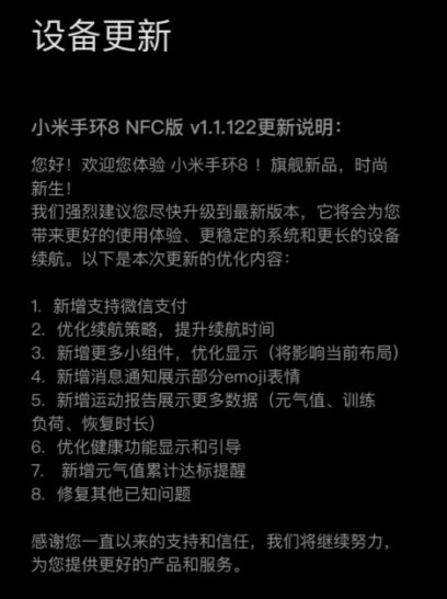4 月 22 日消息,據IT之家網友反饋,小米手環 8 NFC 版迎來了 v1.1.122 更新,新版本“帶來更好的使用體驗、更穩定的系統和更長的設備續航”,新增支持微信支付等。
