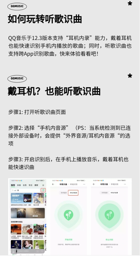 經過測試,當用戶把手機連接到耳機后,QQ 音樂“聽歌識曲”功能會出現“手機內音源”選項,點擊即可識別當前耳機中播放的歌曲,也能跨 App 識別歌曲。