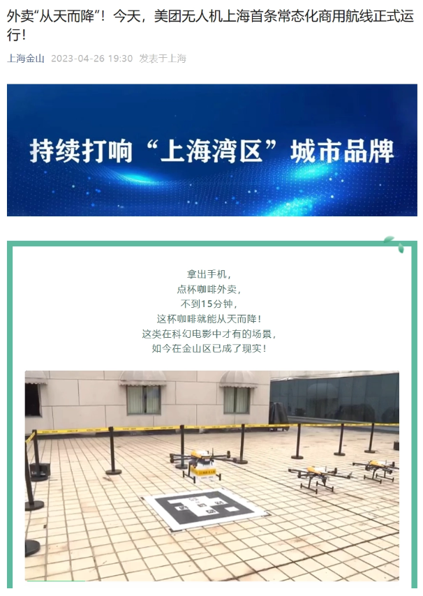 4 月 27 日消息,IT之家從“上海金山”微信公眾號官方獲悉,4 月 26 日,美團無人機上海首條常態化商用航線在金山正式運行,市民可通過美團 App 體驗無人機配送服務。
