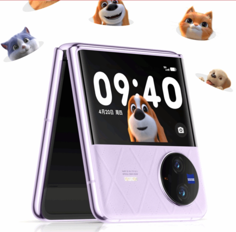 vivo X Flip 提供菱紫、綢金、鉆黑 3 款配色可選,外屏選用 3.0 英寸的 AMOLED 顯示屏,覆蓋肖特賽絢 α 玻璃,可適配 30+ 應用,包括抖音、小紅書等。內屏選用一塊 6.74 英寸的 AMOLED 顯示屏,支持 120Hz 刷新率和 1920Hz PWM 高頻調光。該機同樣采用自研水滴鉸鏈,支持多角度懸停。