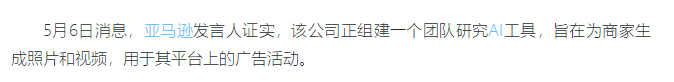 5月6日消息,亞馬遜發(fā)言人證實(shí),該公司正組建一個(gè)團(tuán)隊(duì)研究AI工具,旨在為商家生成照片和視頻,用于其平臺(tái)上的廣告活動(dòng)。